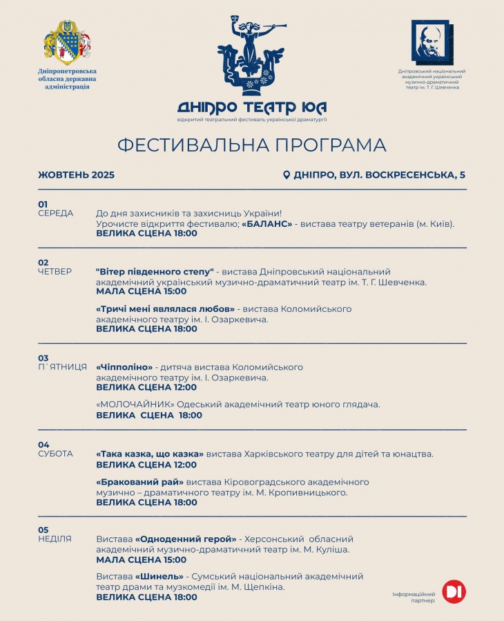 - 2 жовтня о 15:00 можна буде подивитися виставу "Вітер південного степу" Дніпровського музично-драматичного театру ім. Т. Г. Шевченка. Також о 18:00 на сцені виступатиме Коломийський академічний театр імені Івана Озаркевича (Прикарпаття) з виставою Тричі мені являлася любов".