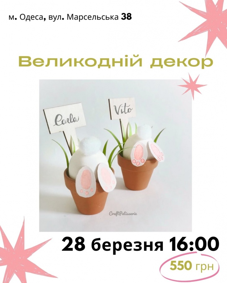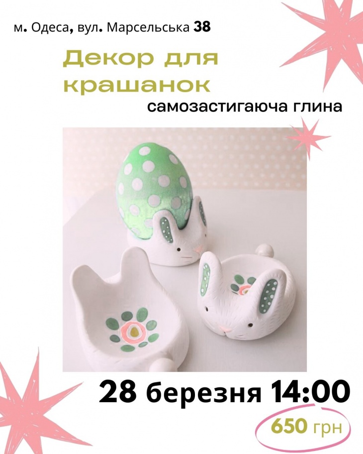 - 16:00 — Пасхальный декор. Лепим милых зайчиков в мини-горшках. Работаем с формой, пропорциями и мелкими деталями – ушки, кавычки, румянец. Атмосферная композиция, придающая простору праздничному настроению.