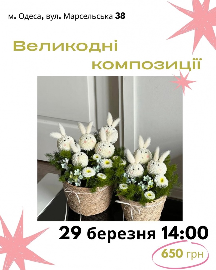 - 14:00 – Пасхальные композиции Создаем объемную праздничную композицию: зайчики, цветы, зелень и декоративные акценты в корзине. Учимся гармонично сочетать текстуры и цвета, чтобы работа выглядела целостно и стильно.