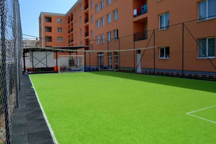 На территории: сцена с профессиональным освещением 5мх9мх0,60м, имеющееся и диско-освещение; оборудованный медицинский кабинет с дежурными врачами, находится при входе в отель (обязательное наличие медицинского страхования); спортплощадка с искусственной травой (баскетбол, волейбол, минифутбол), street-фитнесс, открытый танцевальный зал на подиуме 8мх8м с покрытием линолеум (для репетиций, йоги, пилатеса, гимнастики, различных тренировок), камеры хранения для багажа. В фойе отеля расположен настольный теннис (бесплатно), а в уютном месте – Чилаут – зона и палатки для отдыха. В вечернее время работает «Звездный кинотеатр». В прачечной гостиницы за доп. плату (2,5 евро) предлагается стирка белья.