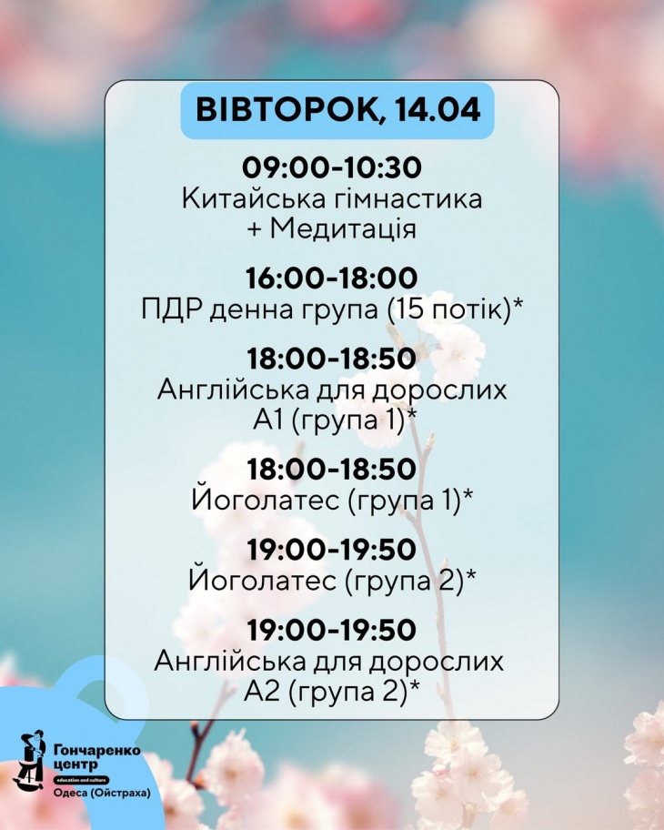 - вівторок, 14.04 18:00-19:00, 19:00-20:00