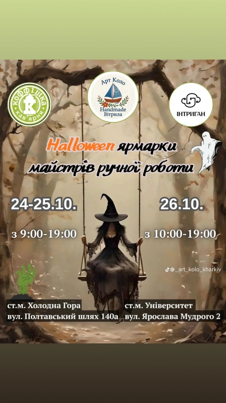 Не пропустіть яскраву подію зі страшним святом. Відпочинь в ці теплі осінні дні. Ви зможете не тільки придбати особливі подарунки ручної роботи, в також скоштувати оригінальне меню, смаколики та каву в кав'ярн " Інтриган".