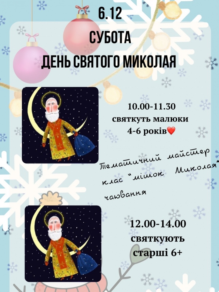 - 10:00 -11:30 — мастер-класс "Мешок Николая" + чаепитие, 4-6 лет