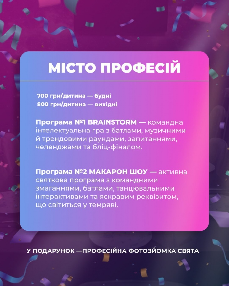 Обирайте свій ідеальний формат та бронюйте дату вже зараз, щоб подарувати дітям незабутнє свято без зайвих турбот!