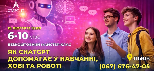 Запрошуємо школярів разом із батьками на демонстраційний майстер-клас, під час якого учасники побачать практичні приклади використання ChatGPT, дізнаються, як правильно працювати з ШІ-інструментами, та зрозуміють, як вони можуть стати корисними помічниками у навчанні й повсякденному житті.