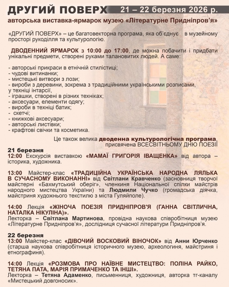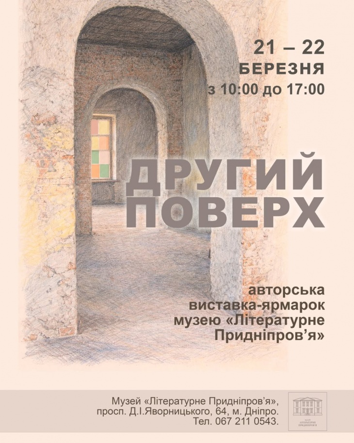 Дорогі друзі! 21 – 22 березня у музеї «Літературне Придніпров’я»вперше відбудеться дводенна музейна авторська виставка-ярмарок «Другий поверх»із запрошенням найкращих майстрів і майстринь хендмейду столиці Придніпров’я.