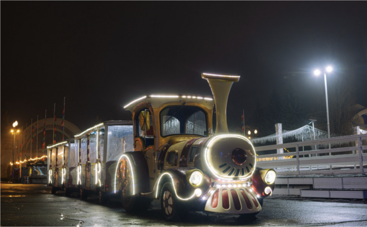 Святковий потяг м’яко ковзає алеями поміж сяючими інсталяціями та яскравими вогнями. Під час поїздки можна почути тематичну аудіоекскурсію, роздивитися головну ялинку зимового сезону та відчути атмосферу свята у кожній деталі. Це чудова нагода побачити ВДНГ у всій його зимовій красі, зручно вмостившись у теплому вагончику та вітаючи перехожих із віконця.