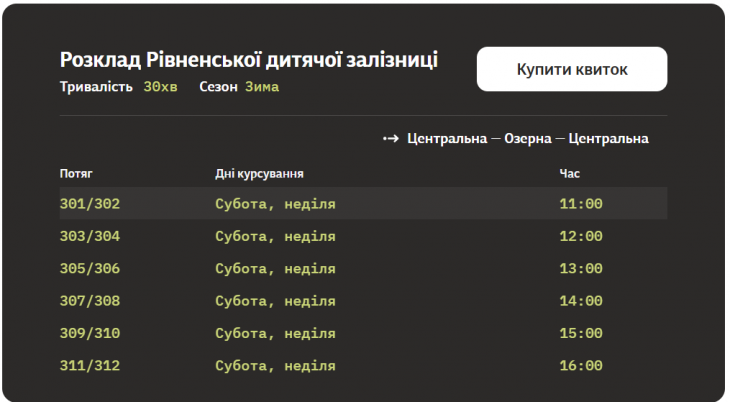 - Дорога працює з 9 травня до останньої неділі вересня, по суботах, неділях і святкових днях. Відправлення першого поїзда зі ст. Партизанська о 11:00, відправлення останнього поїзда зі ст. Партизанська о 16:00.