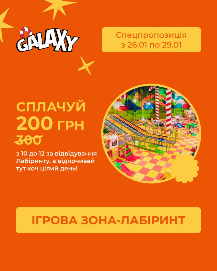 - 10:00 – 12:00 оплачивай посещение игровой зоны «Лабиринт» 200 грн. (вместо 300 грн.) и развлекайся здесь целый день