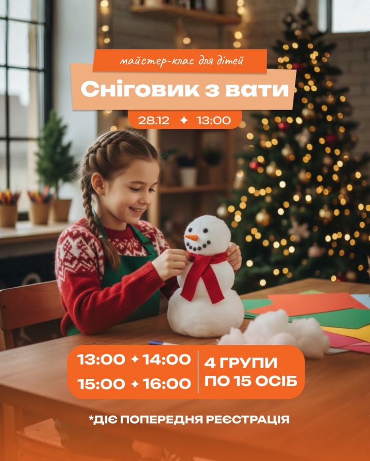 28.12 в 13:00, 14:00, 15:00 и 16:00 - Мастер-класс «Снеговик из ваты»