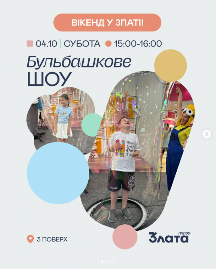 У суботу на малюків чекатиме яскравий аквагрим та захоплююче бульбашкове шоу.