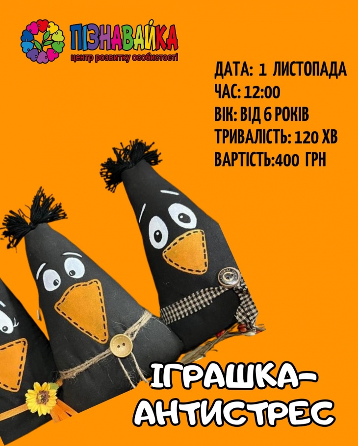 - 12:00 Мастер-класс "Игрушка-антистресс", 6+. Продолжительность 2 часа. Стоимость – 400 грн
