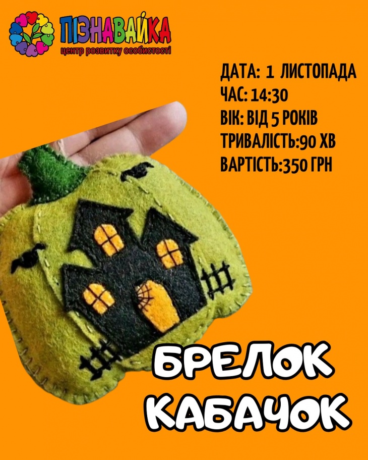 - 14:30 Мастер-класс "Брелок Кабачок", 5+. Продолжительность 90 минут. Стоимость – 350 грн