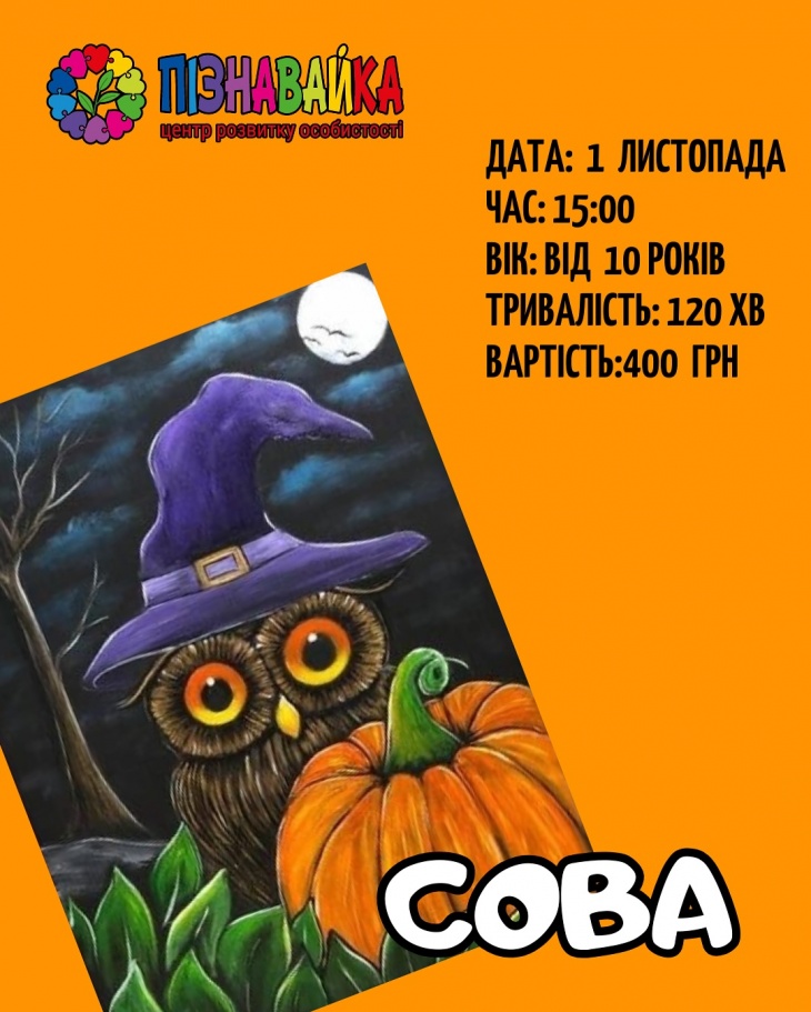 - 15:00 Мастер-класс "Сова", 10+. Продолжительность 2 часов. Стоимость – 400 грн
