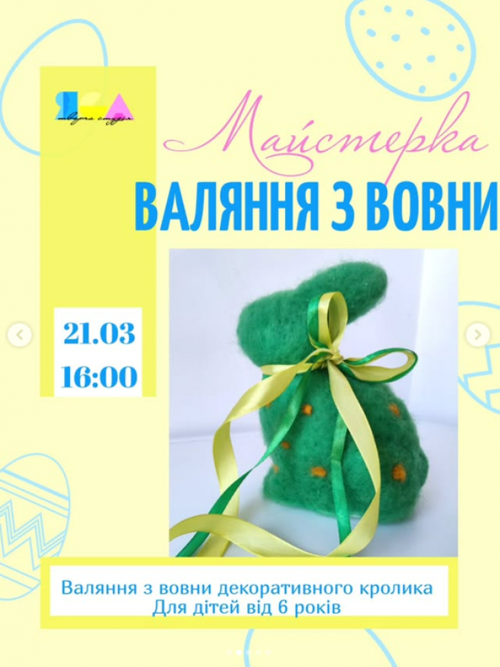 - 21.03 /субота/ о 16.00 майстерка з валяння великоднього кролика для діток від 6 років.