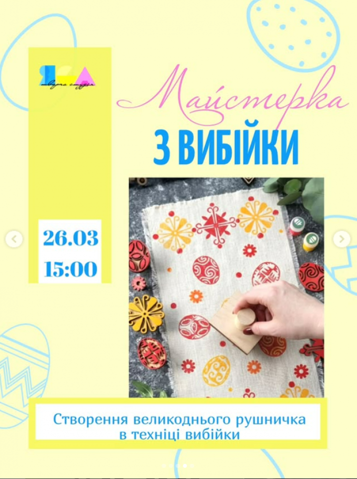 - 26.03 /четвер/ о 15.00 майстерка зі створення великоднього рушничка у техніці вибійки для дорослих або дорослих з дітками.