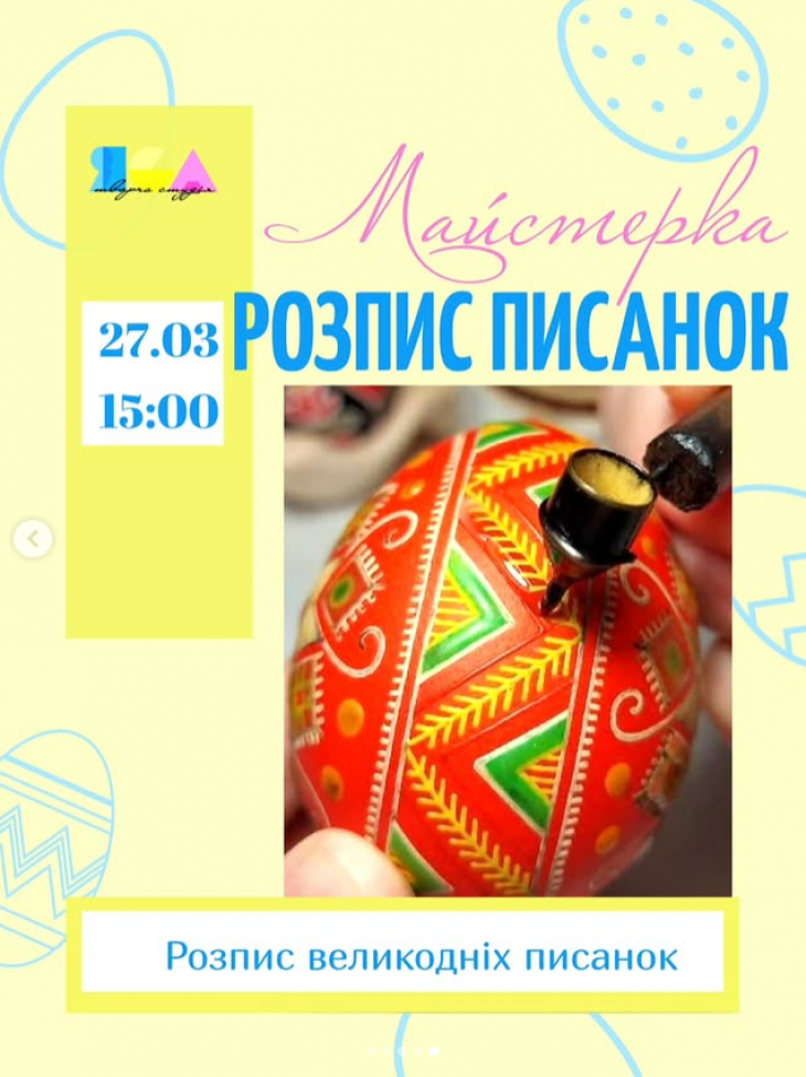 - 27.03 /п'ятниця/ о 15.00 майстерка з розпису писанок. Запрошуємо дорослих і діток.