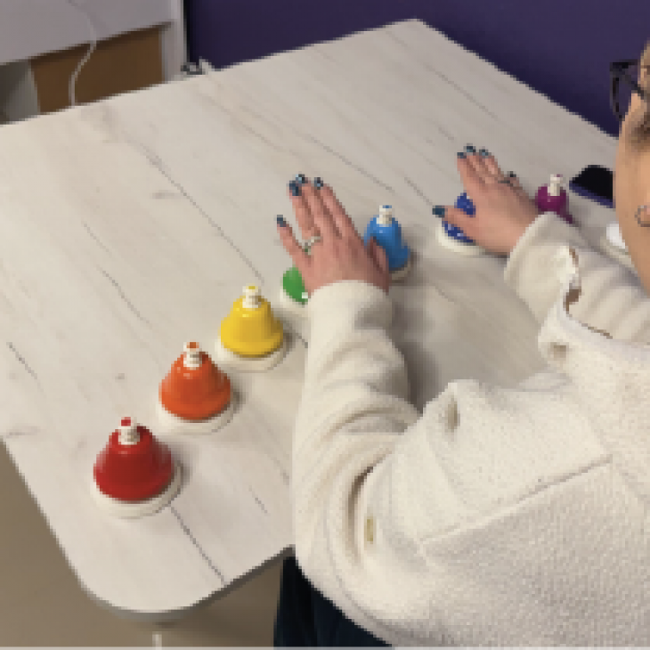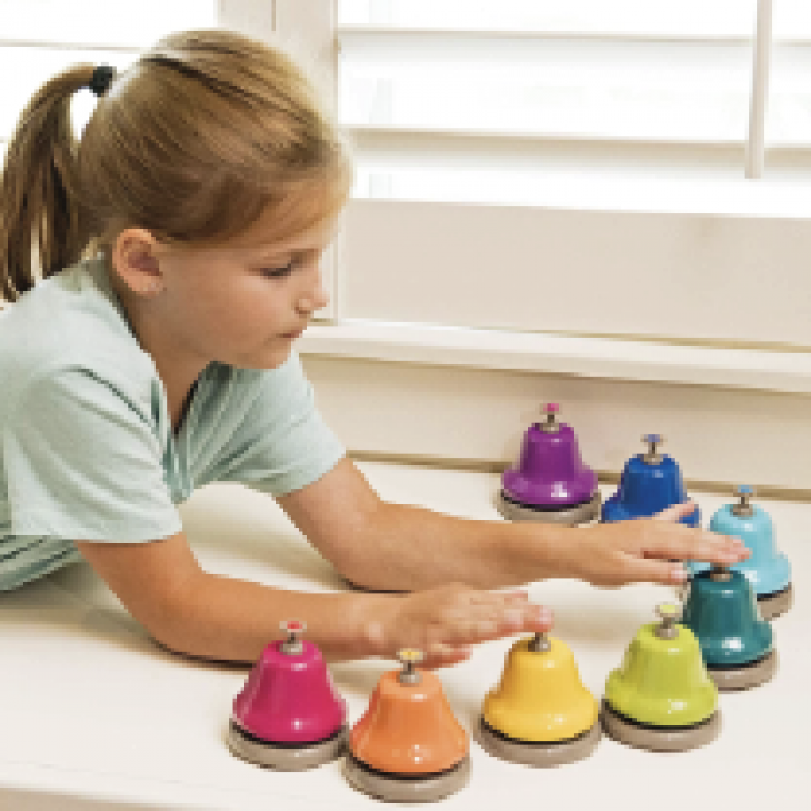 Мы работаем со специальными колокольчиками, помогающими развивать ритм, слух, внимание и координацию.