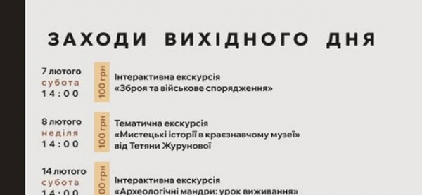 Дорогі відвідувачі! Пропонуємо вам сховатись від холоду та негоди в стінах нашого музею, адже ми підготували для вас цікаву та різноманітну програму заходів вихідного дня!